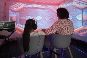 El académico explica que la muestra –cuya descripción en breves palabra sería “historia del universo”–, se constituye en la participan de dos personas simultáneamente que durante diez minutos se sumergen en un viaje recorriendo los orígenes del universo.