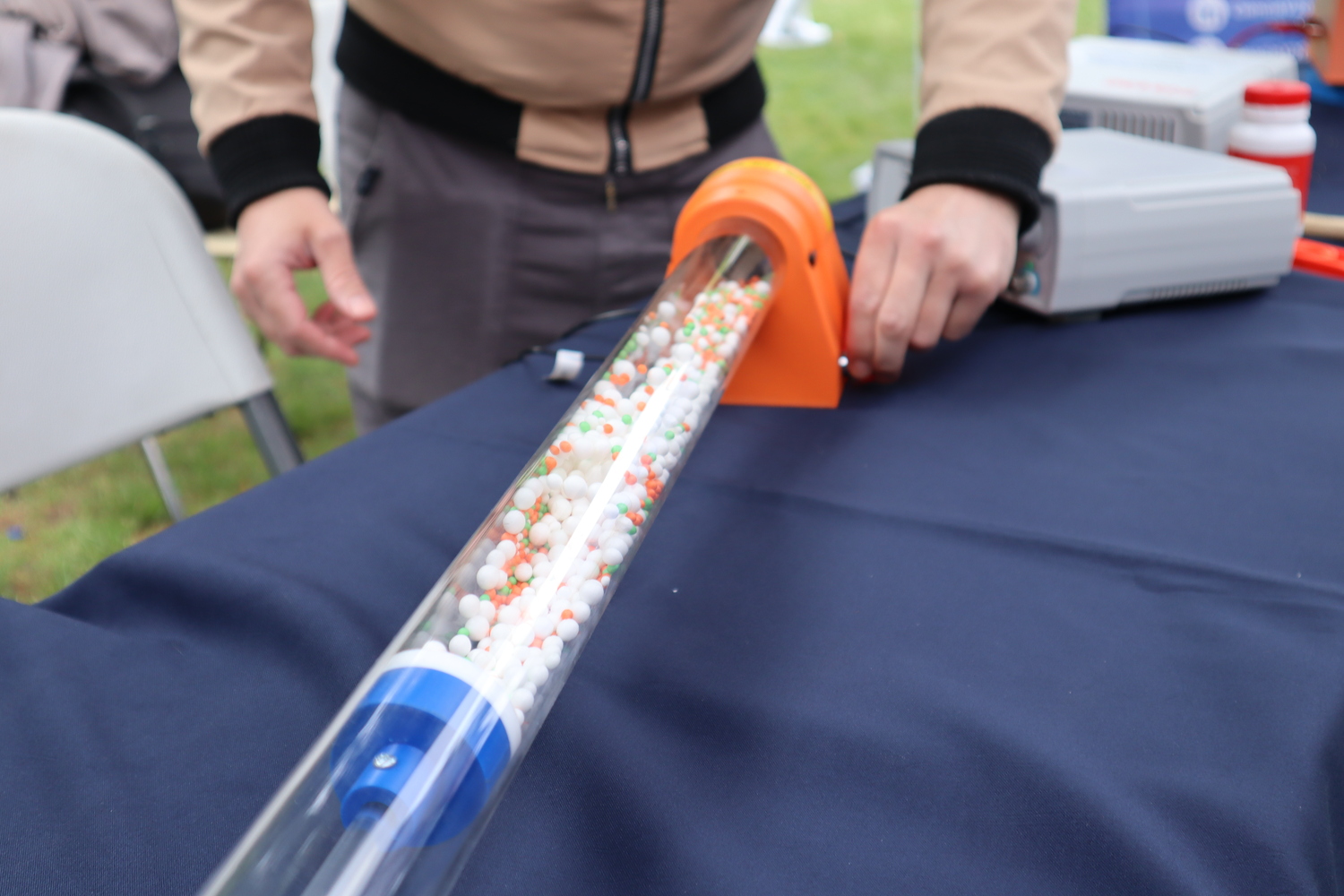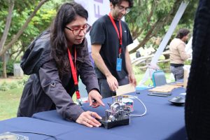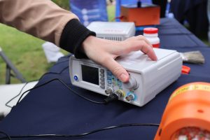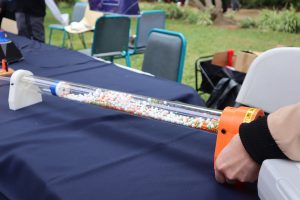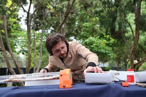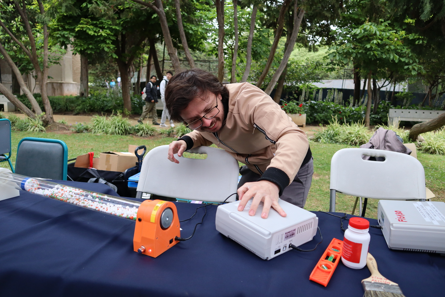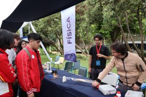 Además, las y los visitantes pudieron experimentar fenómenos físicos de manera práctica gracias a la colaboración del apoyo académico Alfredo Navarro, quien junto a un grupo de estudiantes del DFIS lideró demostraciones sobre difracción de electrones, espectros de luz, bola de plasma, cubeta de ondas, anillo de Thompson, entre otros montajes experimentales.