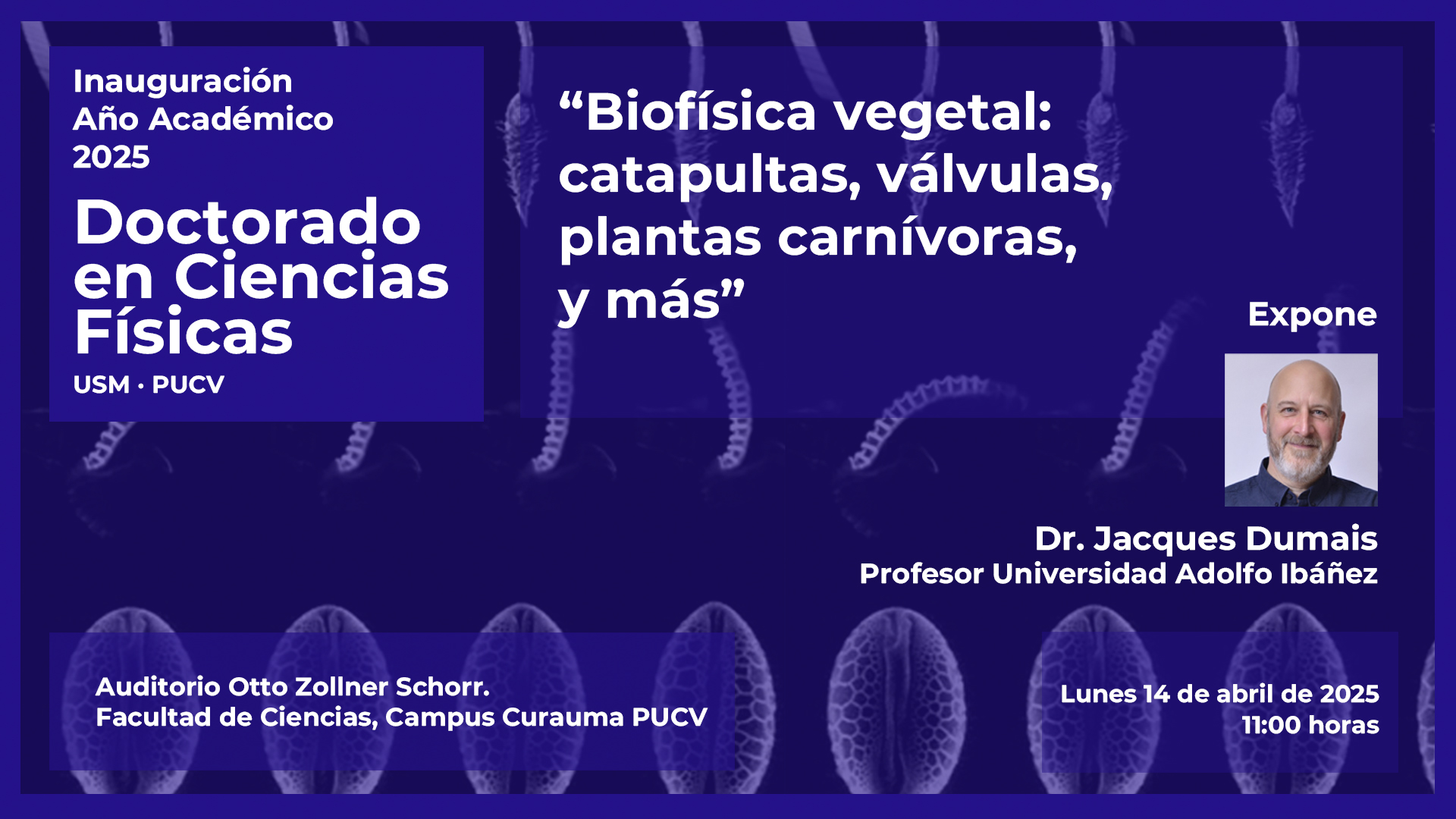 Lugar: Auditorio Otto Zollner Schorr. Facultad de Ciencias, Campus Curauma PUCV (Av. Universidad 330, 1ª piso, Curauma, Valparaíso).